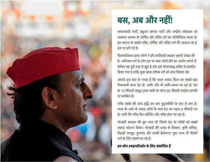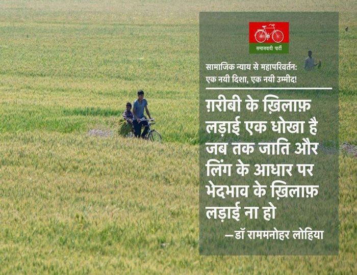अखिलेश यादव ने पार्टी का घोषणापत्र जारी करते हुए कहा कि अमीरी-गरीबी की खाई बेहद गहरी हो चुकी है। हम सभी वर्गों के हितों का खयाल रखेंगे। सामाजिक न्याय से महापरिवर्तन नई दिशा- एक नई उम्मीद के साथ हमने लक्ष्य तय किये है।