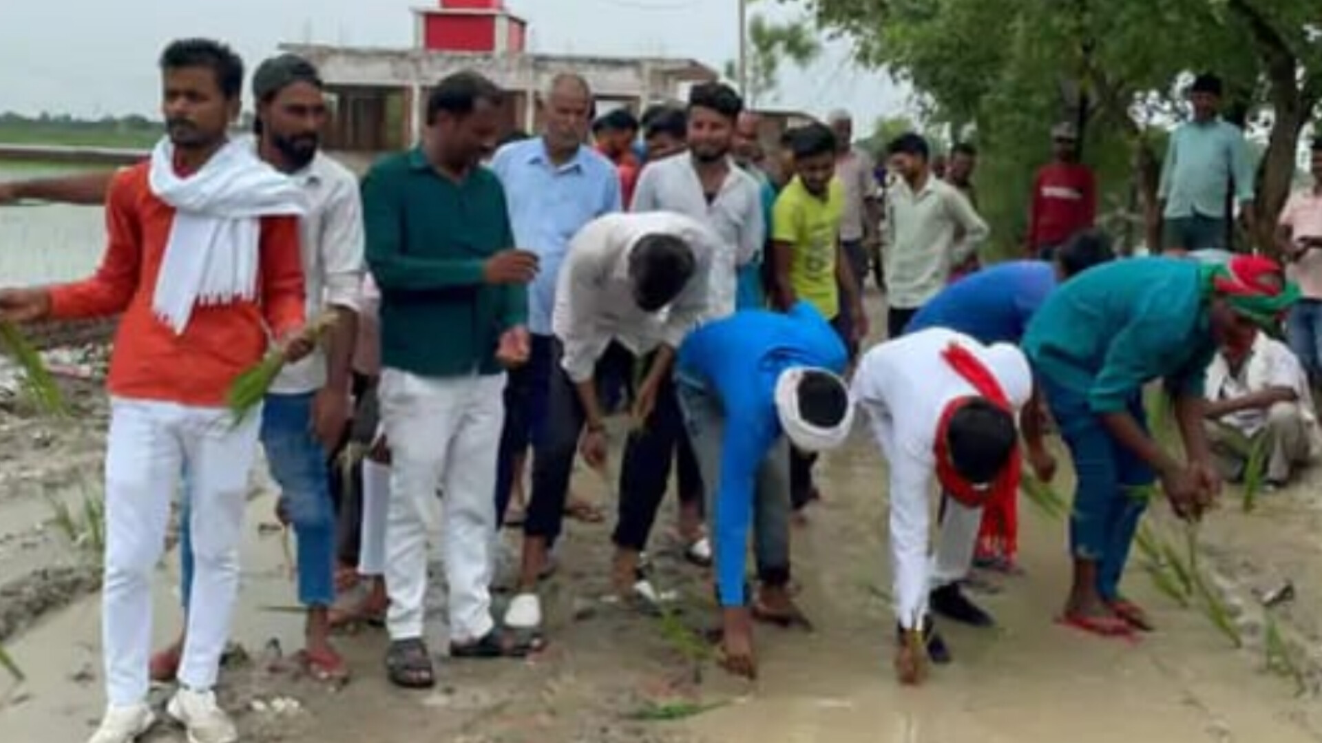 बलिया में ग्रामीणों ने सड़क पर की धान की रोपाई, जलजमाव को लेकर जताया विरोध