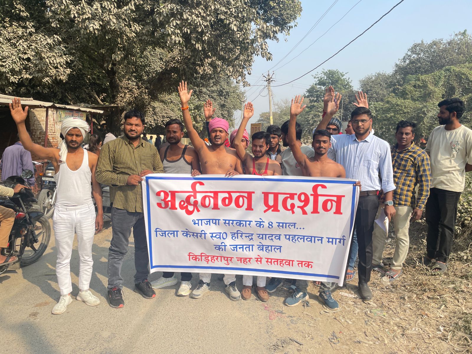 बलिया के नगरा में किडिहरापुर नहर से 17वाँ तक जर्जर पड़ी सड़क को लेकर ग्रामीण काफी ज्यादा परेशान हैं। ऐसे में समाजवादी युवजन सभा के प्रदेश सचिव रवि प्रकाश ने ग्रामीणों के साथ अर्द्धनग्न प्रदर्शन किया।